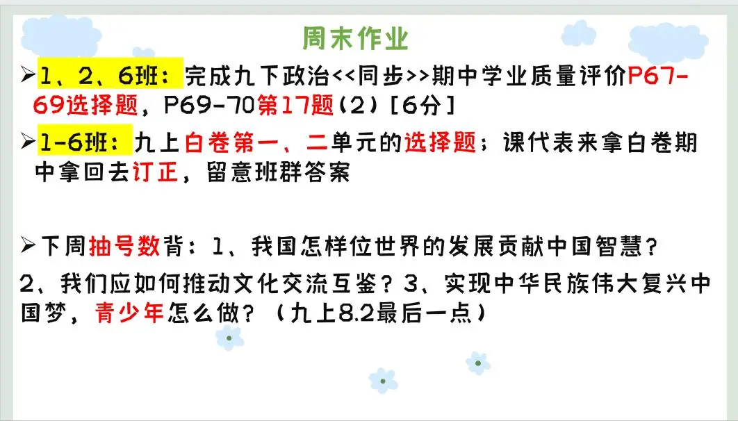 24-26日: (1)完成并订正25-26九上试卷P1-P4页2.2的内容 (2)背诵并默写 ①中华文化的重要性? ②为什么要坚定文化自信?
