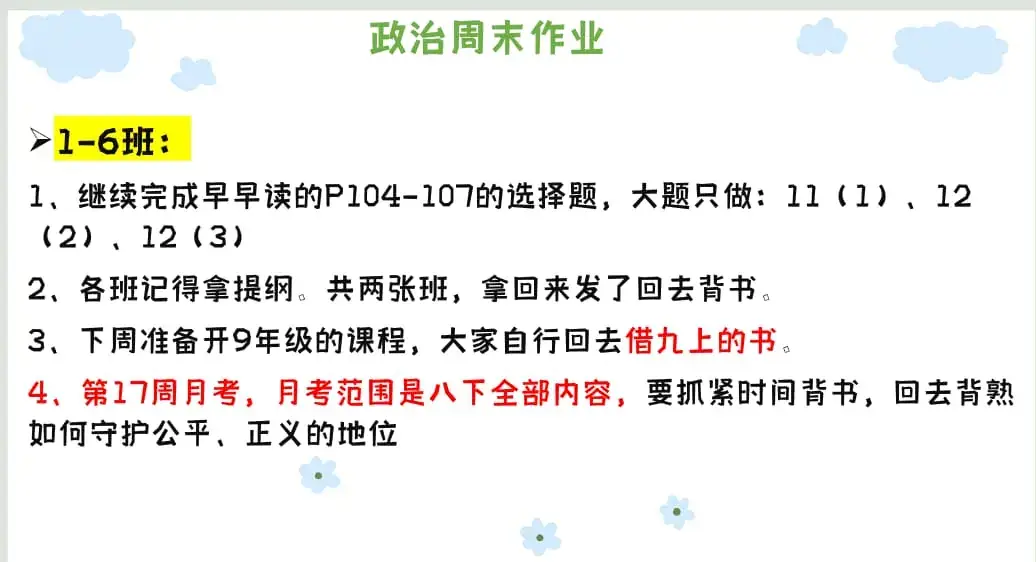 - 背诵第八章第1节知识提纲,下周星期三之内完成
